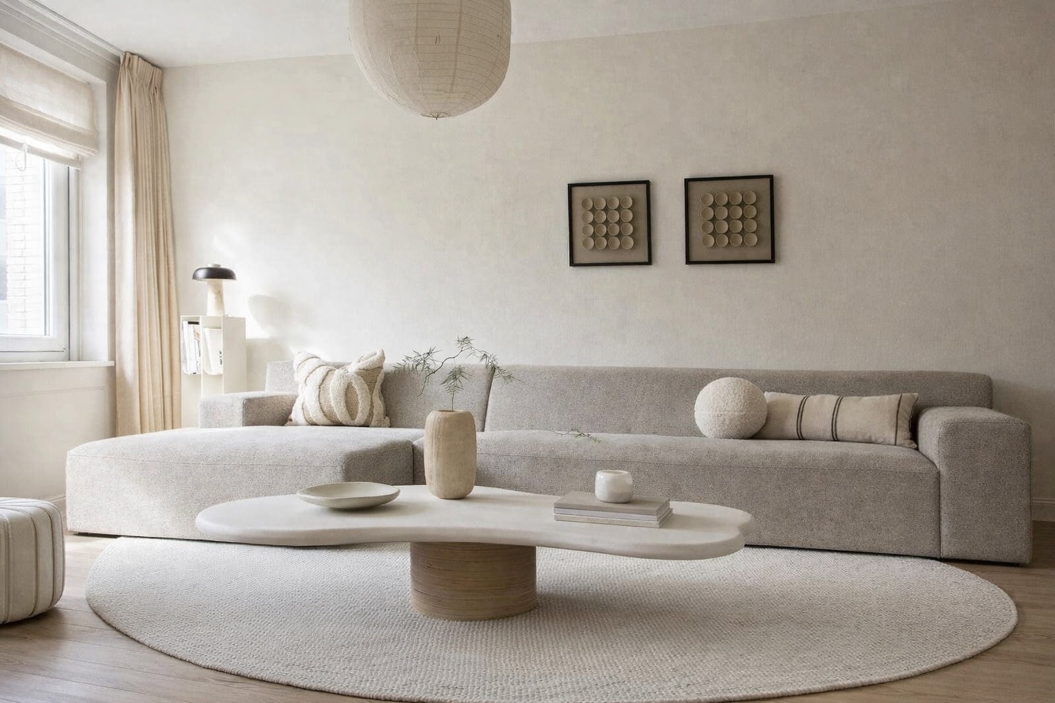 Här ser vi hur Coastal binder samman soffgruppen och skapar en naturlig samlingspunkt i vardagsrummet. Den runda formen mjukar upp rummets linjer och tillför en organisk balans till de mer strama möblerna. Färgen smälter vackert in i den ljusa paletten, men tillför samtidigt ett subtilt djup tack vare sin struktur. Det är just i det lågmälda som det intressanta händer – när texturer får tala istället för färgkontraster.
